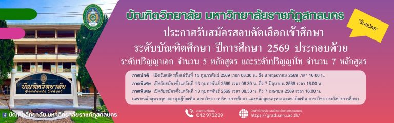 ประกาศมหาวิทยาลัยราชภัฏสกลนคร เรื่อง รายชื่อผู้มีสิทธิ์เข้าศึกษาต่อระดับบัณฑิตศึกษา (ภาคพิเศษ) ประจำปีการศึกษา 2566 ให้ผู้ที่สอบผ่านการคัดเลือกกรอกข้อมูลประวัติส่วนตัว โดยสามารถเข้าไปกรอกข้อมูลที่ลิงก์ https://gsmis.snru.ac.th/preregister ได้ในวันที่ 19 กรกฎาคม พ.ศ. 2566 เป็นต้นไป พร้อมปริ้นซ์ข้อมูลดังกล่าวมารายงานตัวขึ้นทะเบียนเป็นนักศึกษา ในวันที่ 21 กรกฎาคม พ.ศ. 2566 ตั้งแต่เวลา 08.30 – 11.00 น. ณ หอประชุมจามจุรี 1 มหาวิทยาลัยราชภัฏสกลนคร