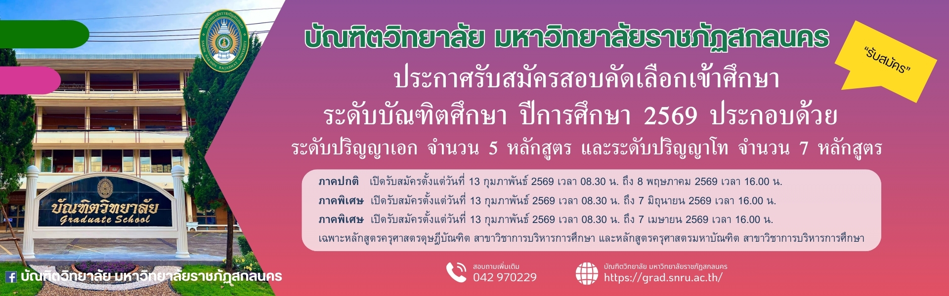 บัณฑิตวิทยาลัย มหาวิทยาลัยราชภัฏสกลนคร เปิดรับสมัครเพื่อคัดเลือกบุคคลเข้าศึกษาระดับบัณฑิตศึกษา ประจำปีการศึกษา 2569 ประกอบด้วย ระดับปริญญาเอก จำนวน 5 หลักสูตร และระดับปริญญาโท จำนวน 7 หลักสูตร มีรายละเอียดเกี่ยวกับหลักสูตรที่เปิดรับ จำนวนที่ประกาศรับ คุณสมบัติของผู้สมัคร วิธีการสมัคร เอกสารในการสมัคร การชำระค่าสมัคร ปฏิทินการสอบคัดเลือก การรายงานตัวเข้าศึกษา ค่าบำรุงการศึกษา และค่าธรรมเนียม ตามรายละเอียดแนบท้ายประกาศนี้