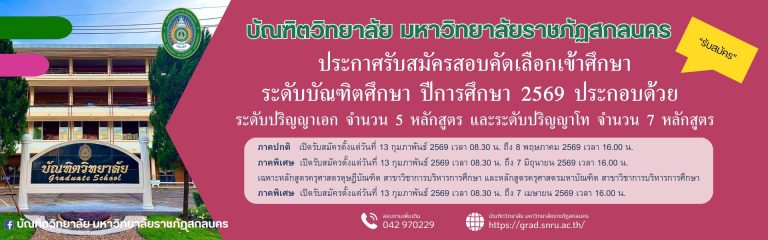 ประกาศรับสมัครสอบคัดเลือกเข้าศึกษาระดับบัณฑิตศึกษา ปีการศึกษา 2569 ประกอบด้วย ระดับปริญญาเอก จำนวน 5 หลักสูตร และระดับปริญญาโท จำนวน 7 หลักสูตรadmin