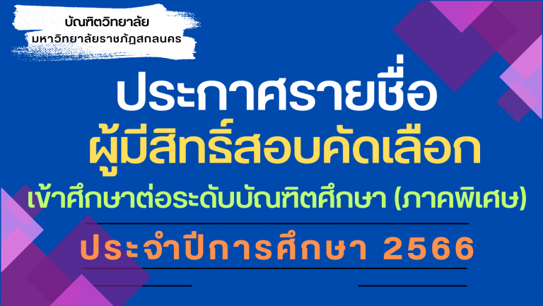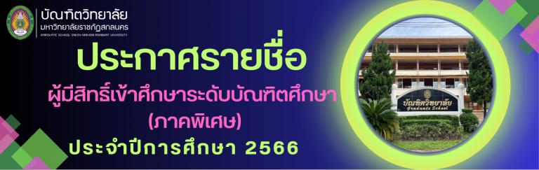 ประกาศมหาวิทยาลัยราชภัฏสกลนคร เรื่อง รายชื่อผู้มีสิทธิ์เข้าศึกษาต่อระดับบัณฑิตศึกษา (ภาคพิเศษ) ประจำปีการศึกษา 2566admin
