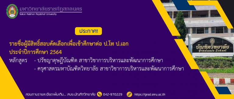 ประกาศรายชื่อผู้มีสิทธิ์เข้าศึกษาต่อ ระดับบัณฑิตศึกษา (ภาคพิเศษ) ปีการศึกษา 64 สาขาวิชา ปร.ด.การบริหารและพัฒนาการศึกษา และ ค.ม.การบริหารและพัฒนาการศึกษาadmin